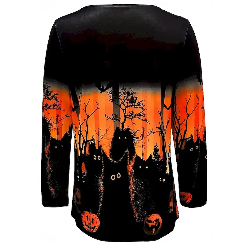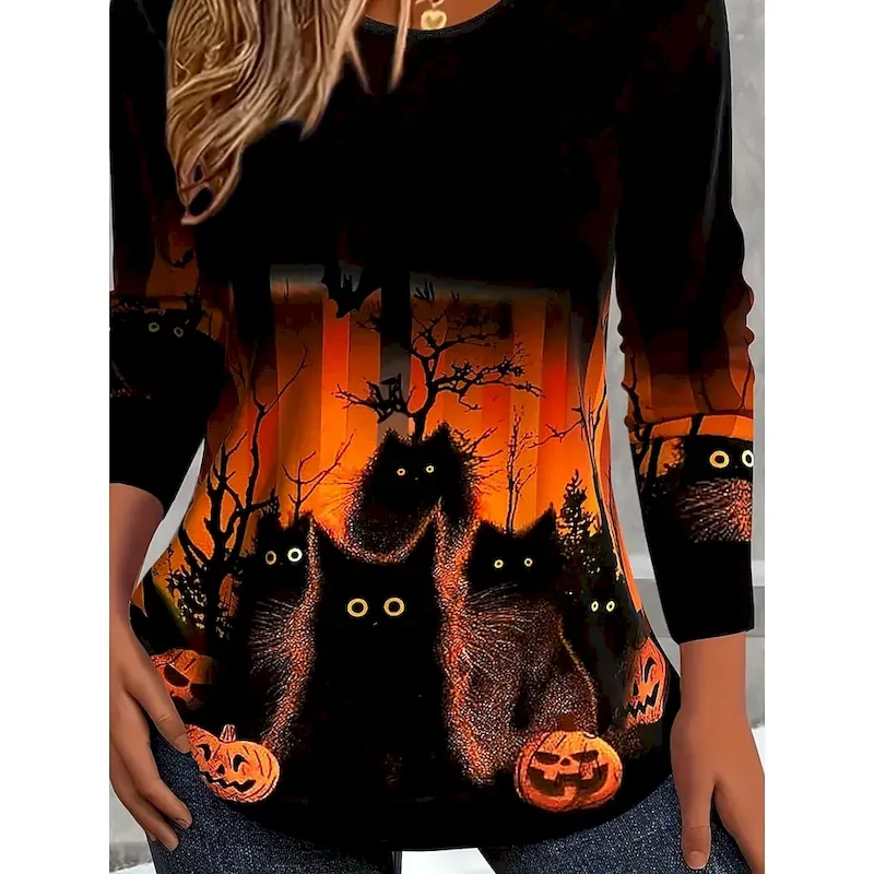 Halloween-Womens-T-shirt-Pumpkin-Graphic-Cat-Vintage-Stylish-Classic-Long-Sleeve-Crew-Neck-Regular-Tops-Daily-Print-Orange-Spring-Fall-Winter