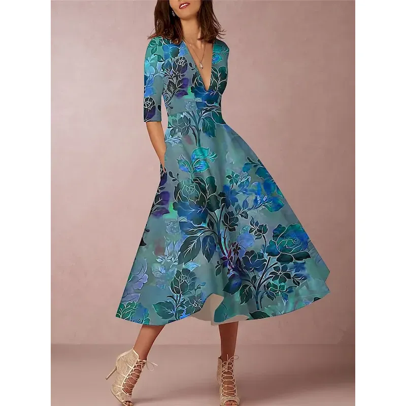 [Fabric] This women’s midi dress is crafted from a high-quality polyester and cotton spandex jersey blend, offering a smooth and comfortable texture. The fabric provides a flexible fit, making it ideal for a variety of occasions.[Cut and Fit] Designed with an A-line silhouette, this dress naturally enhances the waistline while allowing for effortless movement. The deep V-neckline adds a touch of femininity, complementing the three-quarter length sleeves for a chic look suitable for spring, fall, and winter.[Design Highlights] Featuring a vibrant floral print, this dress is both stylish and modern. It includes practical pockets that blend seamlessly into the design. The deep V-neck and swing cut create a graceful and elegant appearance, perfect for making a statement at any event.[Occasions] This versatile dress is perfect for cocktail parties, weddings, vacation gatherings, tea parties, or any event where you want to make an impression. Its fashionable and mature style ensures you feel both comfortable and confident.[Size Range] Available in a variety of sizes from S to XXL, ensuring a perfect fit for every body type.OK