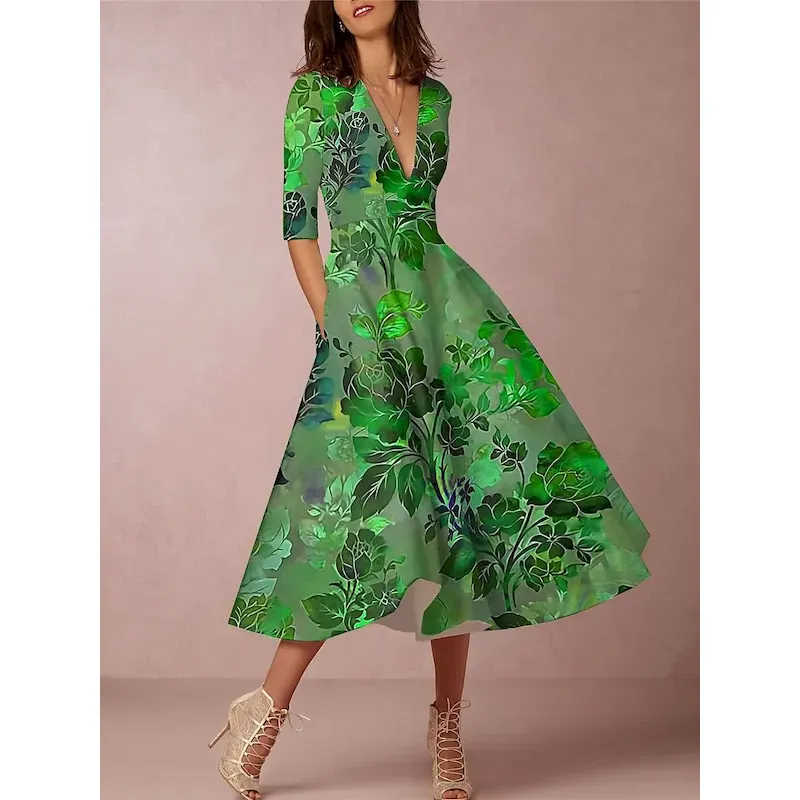 Women’s Midi Dress Party Dress Cocktail Dress Wedding Guest Dress Swing Dress Fashion Party Modern Formal Winter Dress Vacation Regular Fit Floral 3/4 Length Sleeve Deep V Red Blue Green Spring Fall