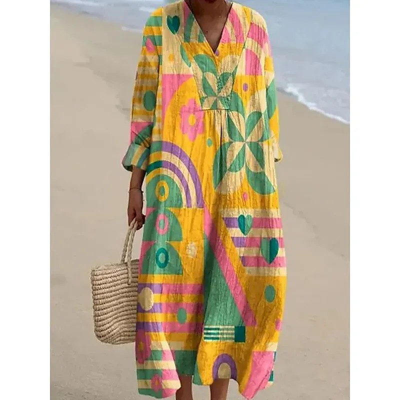 Women’s Midi Dress V Neck Long Sleeve Kaftan Lightweight Loose Fit Shift Dress Casual Going out Loose Fit Graphic Geometric Long Sleeve V Neck Dark Yellow Yellow Pink Blue Fall