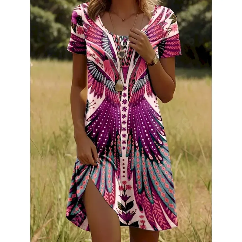 1.Dresses Type: Sundress T Shirt Dress Tee Dress2.Design: Print3.Occasion: Beach4.Dress Length Type: Mini Dress5.Neckline: Crew Neck