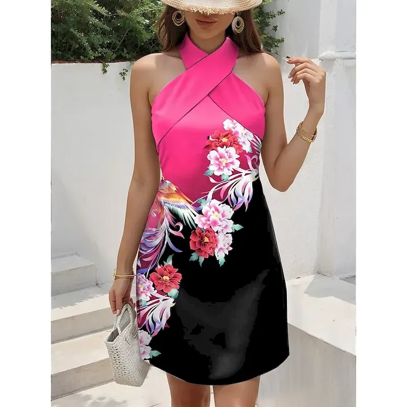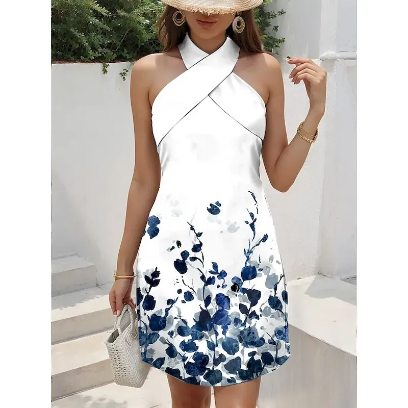 Women’s Mini Dress Sundress A Line Dress Halter Dress Vacation Casual Going out Regular Fit Floral Graphic Sleeveless V Neck Black White Blue Green Summer