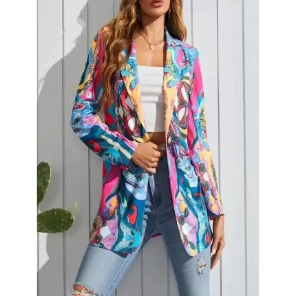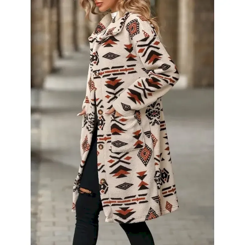 [Design Highlights]: Featuring a classic lapel neckline and single-breasted placket, this jacket stands out with its trendy Aztec-inspired geometric pattern in warm apricot. The notched collar adds a touch of sophistication, while practical side pockets enhance its functionality.