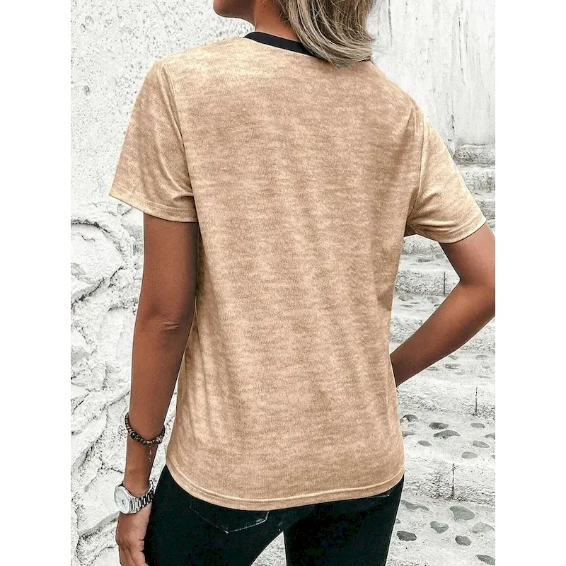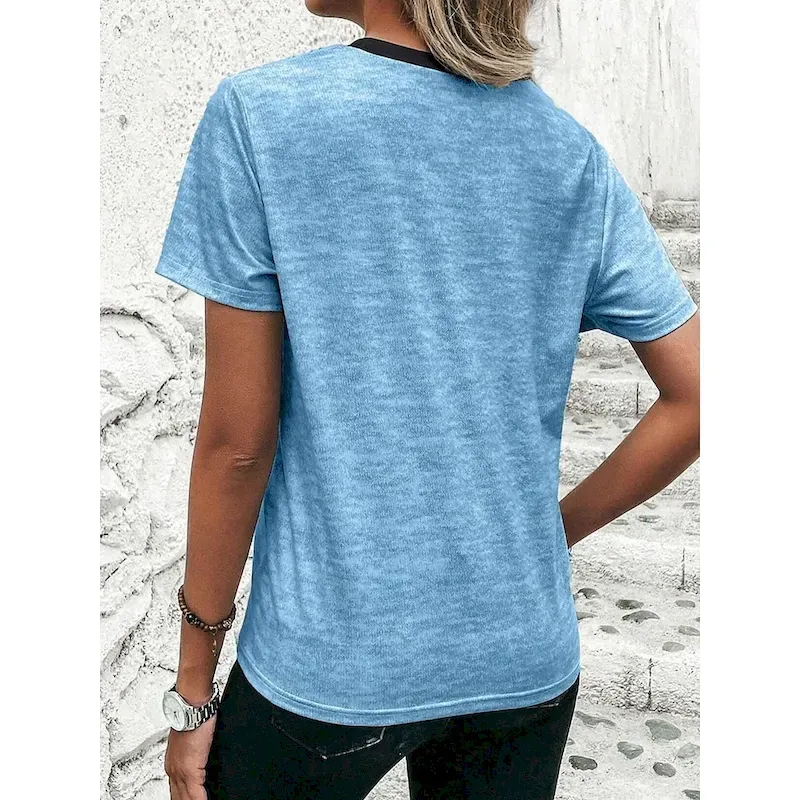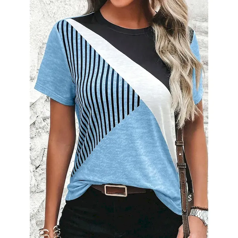 Women’s T Shirt Casual Color Block Print Short Sleeve Regular Tops Round Neck Daily Sky Blue Khaki Gray Summer