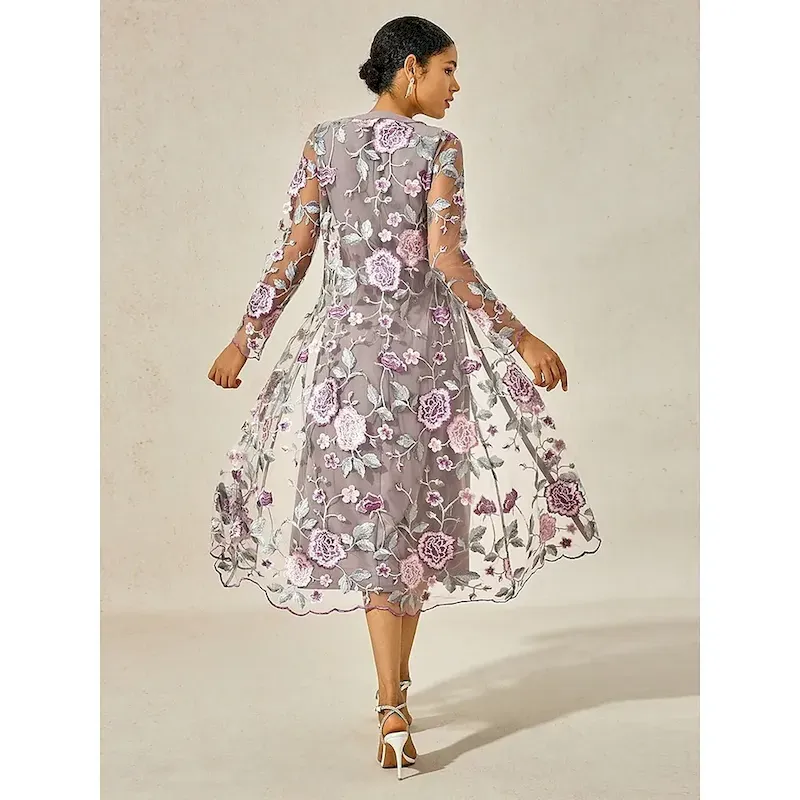 Women’s Tea Length Cocktail Dress Dress Set Wedding Guest Dress A Line Dress Elegant Formal Wedding Party Regular Fit Floral Long Sleeve Crew Neck Gray Pink Summer Spring Fall